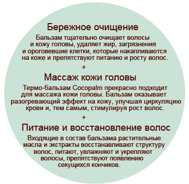 Благодаря своему уникальному составу термо-бальзам Cocopalm был разработан специально, чтобы обеспечить эффективный расслабляющий массаж головы. Он бережно очистит волосы и кожу головы от загрязнений и ороговевших клеток кожи, улучшит циркуляцию крови и произведет необходимый разогревающий эффект, тем самым подготавливая кожу к последующим процедурам.